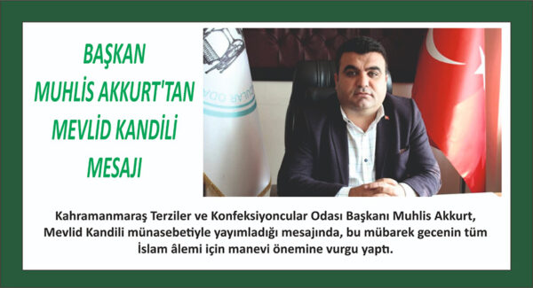 Kahramanmaraş Terziler ve Konfeksiyoncular Odası Başkanı Muhlis Akkurt, Mevlid Kandili münasebetiyle yayımladığı mesajında, bu mübarek gecenin tüm İslam âlemi için manevi önemine vurgu yaptı.