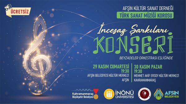 Büyükşehir Belediyesi, Afşin Kültür Sanat Derneği ve Afşin Belediyesi iş birliğiyle 29 Kasım’da Afşin’de, 30 Kasım’da ise Mehmet Akif Ersoy Kültür Merkezi’nde “İncesaz Şarkıları” konseri düzenlenecek.