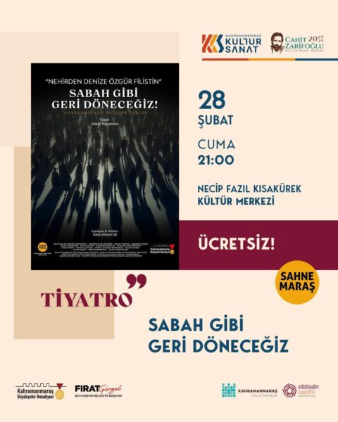 Kahramanmaraş Büyükşehir Belediyesi, Cahit Zarifoğlu Kültür Sanat Sezonu kapsamında düzenlediği etkinliklerine bir yenisini daha ekliyor. Kültür ve sanatın toplum üzerindeki etkisini artırmak amacıyla birbirinden farklı programlara ev sahipliği yapan Büyükşehir Belediyesi, bu kez anlamlı bir tiyatro gösterisini sanatseverlerle buluşturuyor. Sahne Maraş Tiyatro Okulu öğrencileri tarafından sahnelenecek olan “Sabah Gibi Geri Döneceğiz” adlı tiyatro oyunu, Filistin’in mücadelesini konu alarak izleyicilere duygu dolu anlar yaşatacak. Dramatik anlatımı ve güçlü oyunculuk performanslarıyla dikkat çekecek olan oyun, Filistin halkının direnişini ve özgürlük mücadelesini sanat sahnesine taşıyacak.