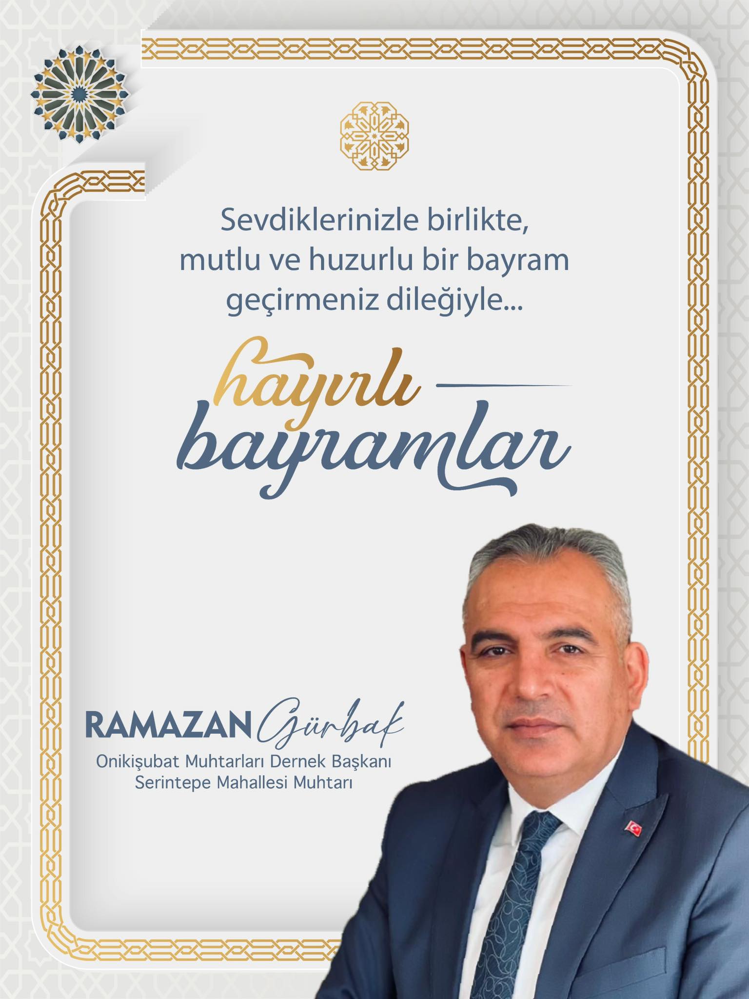 Onikişubat Muhtarlar Derneği Başkanı Ramazan Gürbak, Ramazan Bayramı ile Cuma gününün aynı zamana denk gelmesi dolayısıyla anlamlı bir kutlama mesajı yayımladı.