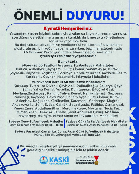 KASKİ Genel Müdürlüğü, şehirde 20 Temmuz Pazar gününden itibaren bazı mahallelerde geçici süreyle içmesuyu kesintilerinin uygulanacağını duyurdu. 6 Şubat depremlerinin ardından zayıflayan su kaynaklarının, son aylarda yaşanan yağışsızlık ve artan sıcaklıklarla birlikte ciddi oranda azaldığı belirtildi. Açıklamada, mevcut kaynakların yetersiz kalması nedeniyle içmesuyu yönetiminde büyük zorluklar yaşandığı ifade edildi. Yaşanan bu olağanüstü durum karşısında altyapının yenilenmesi ve alternatif su kaynaklarının oluşturulması için çalışmaların sürdüğü belirtilirken, geçici süreliğine uygulanacak su kesintileriyle birlikte su dağıtımının belirli saat aralıklarında ve mahallelere göre planlandığı aktarıldı.
